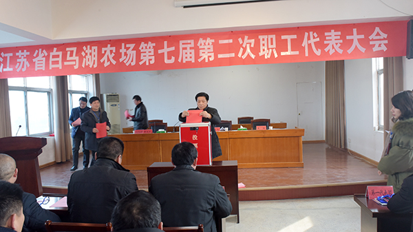 在大會預備會議通報參會人數、通過大會議程后,大會在莊嚴的國歌聲中宣告開幕,黨委書記、場長姚春華作了《關于江蘇省國營白馬湖農場公司制改革方案的說明》,明確了改革的目的和在國有資產處置、法人治理結構、組織領導、進度安排等方面的具體要求和措施,有效地提高了代表們對農場公司制改革的認識和認同。接著,大會又以舉手表決的形式,通過了職工董事、職工監(jiān)事選舉辦法,還按照規(guī)定程序和選舉辦法,分別通過票決、投票選舉和職工代表分別簽字等形式,順利通過了《關于江蘇省國營白馬湖農場公司制改革方案的決議》,選舉產生了一名職工董事和一名職工監(jiān)事。黨委副書記韓正光宣讀了大會決議,宣告農場公司制改革方案順利獲得通過。