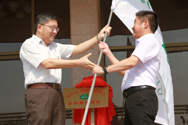 在揭牌授旗儀式上,姚準(zhǔn)明和董光威為新洋農(nóng)場(chǎng)新時(shí)代文明實(shí)踐中心揭牌。楊義林向新洋農(nóng)場(chǎng)有限公司黨委副書(shū)記、董事長(zhǎng)、總經(jīng)理潘元海授新洋農(nóng)場(chǎng)志愿者服務(wù)總隊(duì)隊(duì)旗。新洋農(nóng)場(chǎng)有限公司黨委書(shū)記陳守軍致辭。