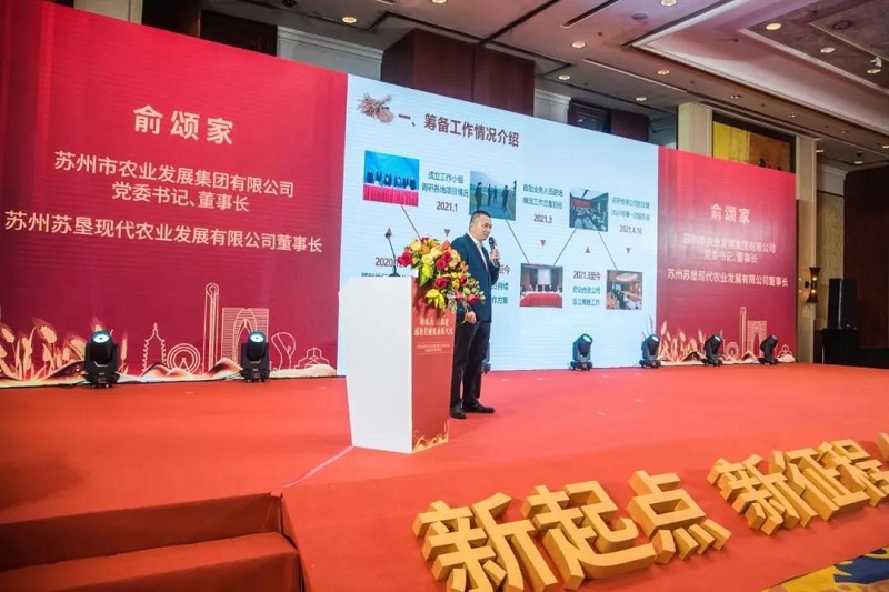 蘇州農(nóng)發(fā)集團(tuán)董事長(zhǎng)、蘇州蘇墾董事長(zhǎng)俞頌家作新公司籌建情況的匯報(bào),從公司籌備工作情況、公司概況和服務(wù)內(nèi)容、發(fā)展目標(biāo)和未來(lái)展望等方面詳細(xì)介紹了新公司的情況。