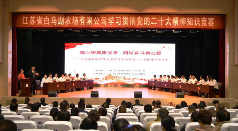 5月5日,白馬湖農(nóng)場公司“凝心鑄魂跟黨走 團(tuán)結(jié)奮斗新征程”學(xué)習(xí)貫徹黨的二十大精神知識競賽在職工禮堂火熱開賽。黨委書記、董事長韓正光,黨委副書記、總經(jīng)理韓樹明,副總經(jīng)理衡愛軍,紀(jì)委負(fù)責(zé)人時奎敬,第二片區(qū)財務(wù)總監(jiān)奚興林出席競賽。來自機關(guān)和各單位的21支代表隊共計63人參加競賽。
