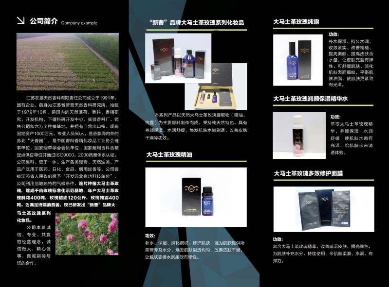 “新曹”牌大馬士革玫瑰系列產(chǎn)品:我公司與上海愛(ài)伽儷日用品公司聯(lián)姻,生產(chǎn)出“新曹”牌大馬士革玫瑰面膜、精華液、純露、復(fù)方精油系列化妝品。新曹香料人始終堅(jiān)持產(chǎn)品高起點(diǎn)、高品質(zhì),工薪階層價(jià)格定位,深受北京、上海、廣東、深圳等一線城市消費(fèi)者喜愛(ài)。