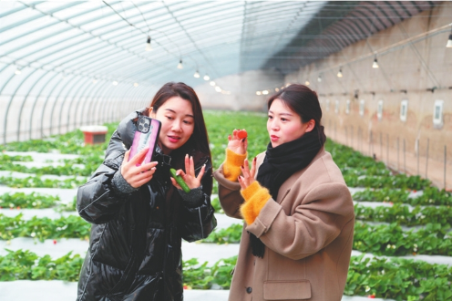 1月16日,江蘇省崗埠農(nóng)場富民農(nóng)業(yè)科技園溫室大棚內(nèi),工作人員正在抖音直播平臺(tái)向消費(fèi)者推介園區(qū)的果蔬、花卉產(chǎn)品。通過開辟線上銷售“新賽道”,讓手機(jī)成為新“農(nóng)具”,讓直播間成為新“柜臺(tái)”,拓寬農(nóng)產(chǎn)品銷售渠道,帶動(dòng)全場溫室大棚種植戶增收。