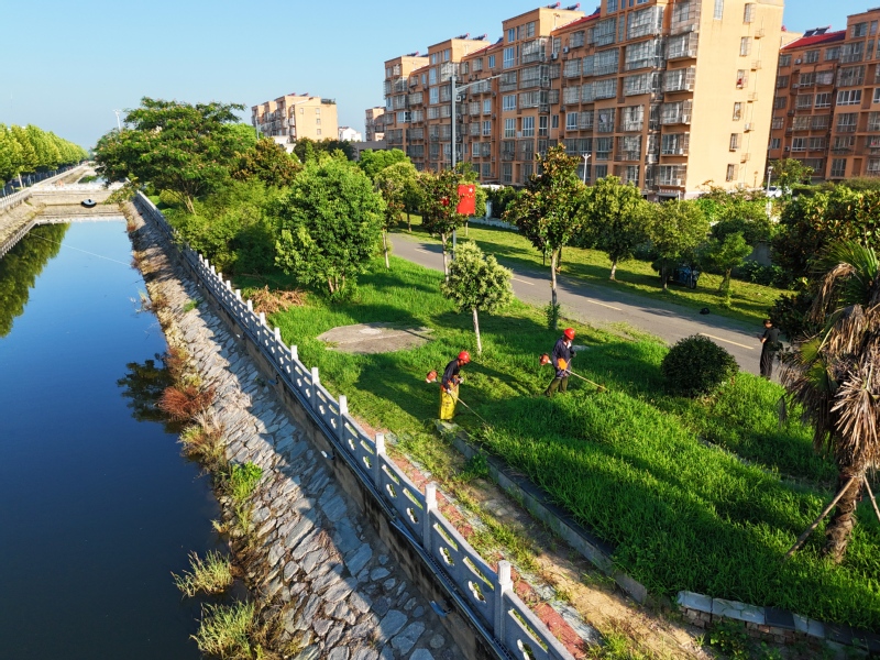 連日來,連云港市海州區(qū)加緊推進(jìn)環(huán)境綜合整治工作,著力打造“河暢、水清、岸綠、景美”的優(yōu)美環(huán)境。圖為8月21日,位于該區(qū)的江蘇農(nóng)墾崗埠農(nóng)場綠化工人在振興河畔修剪管護(hù)草坪。