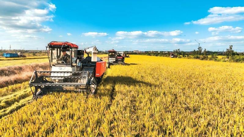 江蘇省鹽城市射陽縣,江蘇農(nóng)墾新洋農(nóng)場(chǎng)工作人員搶收水稻。張偉生攝 (人民圖片)