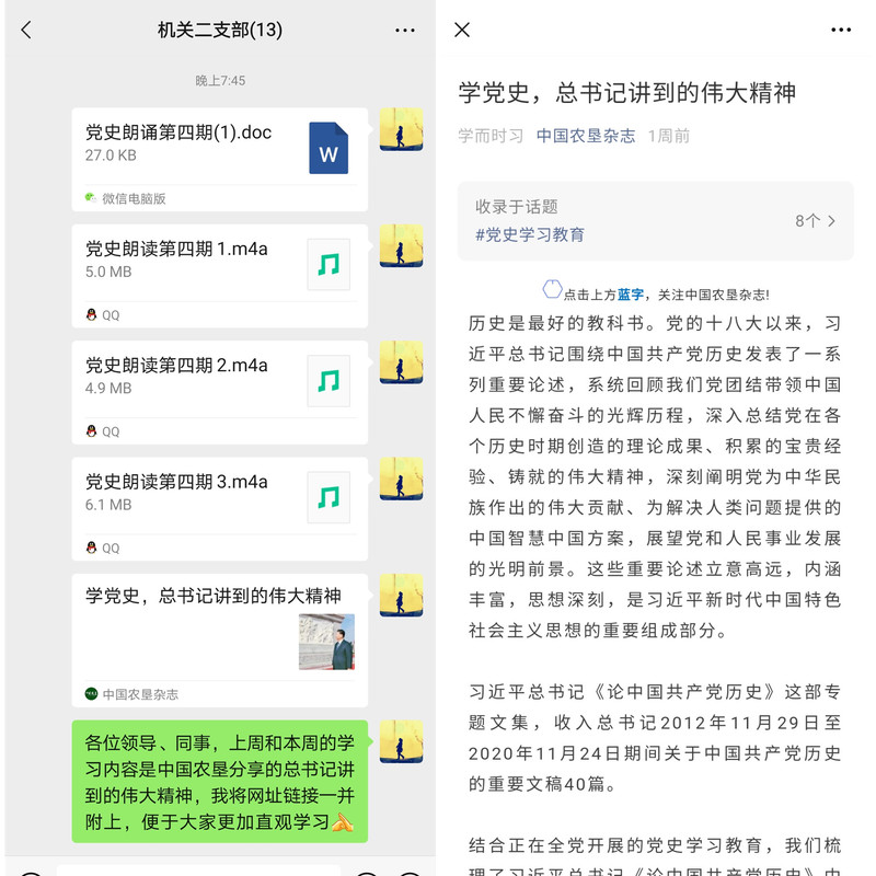 “各位領導、同事,上周和本周的學習內容是中國農墾分享的《總書記講到的偉大精神》,我將網址鏈接一并附上,便于大家更加直觀學習。”5月23日晚,新洋農場有限公司機關二支部黨建助理員在支部微信群里分享了支部黨史朗讀第四期,這是該支部創新黨史學習方式的一個舉措。
