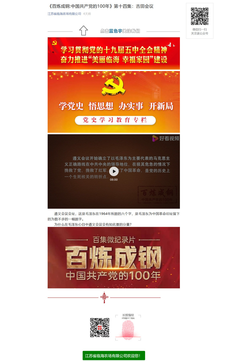 自黨史學習教育啟動以來,臨海農(nóng)場公司黨委積極貫徹落實習近平總書記關于開展黨史學習教育的重要講話精神,利用多媒體平臺,打造黨史學習教育媒體矩陣,引導職工群眾學黨史、悟思想、辦實事、開新局,為建黨100周年獻禮。