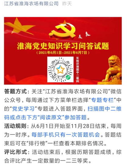 淮海農場公司黨委工作部將在每周一通過農場公司微信公眾號平臺發(fā)布當周黨史學習教育答卷考題,分別以單選、多選、對錯題型出現(xiàn),讓大家在參與中,回顧黨的光輝歷程,謳歌黨的豐功偉績,為推動淮海高質量發(fā)展提供有力保障。據悉,每部手機只有一次答題機會。答題結束后可以在“排行榜”一欄查看自己當期在本周本時段的排名。答題方式:關注“淮海微信公眾號”,每周通過下方菜單欄進入本周答題頁面進行答題。活動獎勵:將根據答題成績和參賽人員數量,最張產生出一定數量的一二三等獎。