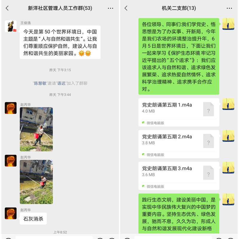 機關二支部則把黨史教育與環(huán)境整治相結合,通過支部黨史朗誦專題學習《保護生態(tài)環(huán)境牢記習近平提出的“五個追求”》,要求大家在農(nóng)場公司黨委的領導下,追求人與自然和諧、追求綠色發(fā)展繁榮、追求熱愛自然情懷、追求科學治理精神、追求攜手合作應對,堅持生態(tài)優(yōu)先、綠色發(fā)展,馳而不息,久久為功,以更美的環(huán)境面貌慶祝建黨百年、迎接建場70周年。
