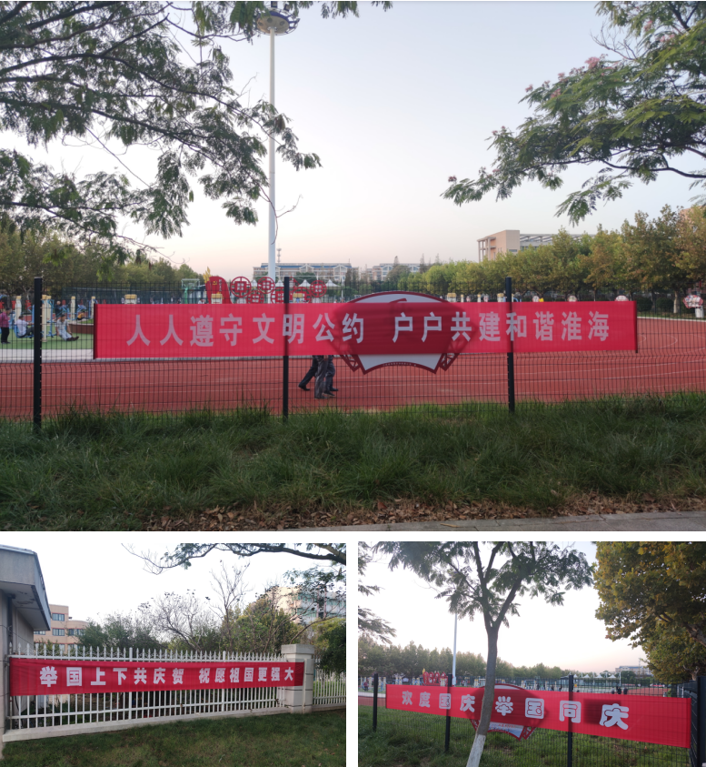 五星紅旗隨風(fēng)招展,喜悅之情更是承載著人們對(duì)美好未來(lái)的向往。轄區(qū)升掛的國(guó)旗,懸掛國(guó)慶標(biāo)語(yǔ),文廣苑樓體上“人民有信仰 國(guó)家有力量 民族有希望”等主題宣傳標(biāo)語(yǔ)等格外醒目,加上農(nóng)場(chǎng)在各個(gè)廣場(chǎng)上開(kāi)展的群眾性文化體育活動(dòng)及廣大職工居民進(jìn)行休閑健身的鏡頭,既呈現(xiàn)出了淮海職工居民在祖國(guó)大家庭懷抱里安定團(tuán)結(jié)祥和的良好社會(huì)氛圍,也再一次激發(fā)著農(nóng)場(chǎng)廣大黨員干部和職工群眾對(duì)黨、對(duì)祖國(guó)母親的無(wú)盡熱愛(ài),昭示著廣大干部群眾在中國(guó)共產(chǎn)黨的領(lǐng)導(dǎo)下,感黨恩、聽(tīng)黨話、跟黨走的信心和決心。圖為淮海在國(guó)慶期間懸掛的宣傳廣告橫幅。