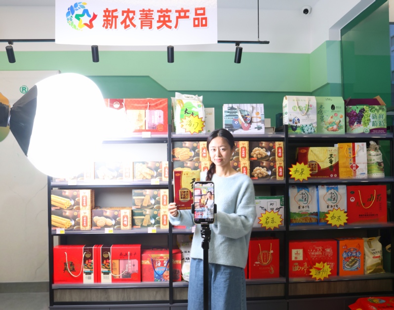 蘇墾南通公司積極與南通團市委合作,在銷售門店開辟“新農菁英產品”專區,匯聚南通各縣市區的地方特色優質農產品,豐富周邊居民的購買選擇。圖為公司青年員工借助抖音直播推廣帶動產品銷售,拓寬增收渠道。