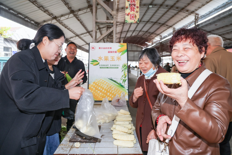 眼下,新洋林業公司種植基地的秋季水果玉米迎來了豐收季,基地內一株株玉米飽滿挺拔,籽粒飽滿,連空氣都彌漫著玉米的清香。公司員工正忙著穿梭于玉米田間采收玉米,不一會兒就裝滿了一大車。基地負責人趙丙華仔細檢查玉米的合格率后,一根根玉米隨即被運往市縣商超、農貿市場、居民小區。“新洋農場‘美爾姿’牌甜糯玉米出鍋啦,口感甜糯脆嫩,不好吃不要錢!”10月27日上午,伴隨著一聲吆喝,新洋農場農貿市場的秋季水果玉米攤位前擠滿了想要嘗鮮的人群,熱氣騰騰,玉米香氣蔓延開來,縈繞鼻尖,讓人垂涎欲滴。熱銷現場,林業公司副總經理蔡仿向顧客們介紹:“這是我們林業公司今年試種的‘白甜糯209’水果玉米新品種,來自連云港市農科院,生吃鮮嫩可口,這樣輕輕掐一下就會爆汁,蒸煮后香甜軟糯、口感更好。現在賣的是晚期甜糯玉米,生產期3個月以上,比春玉米長10多天,營養成分高,更加美味,淀粉含量很低,對減肥人士更加友好,又稱‘美容玉米’。這是今年最后一批玉米了,3元一斤,價格不貴,機不可失,時不再來,歡迎搶購!”“這玉米真甜啊,吃起來糯糯的,脆脆的,是我今年吃過最好吃的玉米了,給我來3斤。”“我要10斤,這你們就不知道了吧,玉米不