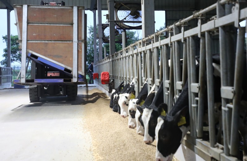 近年來,東辛東旺奶牛公司堅持創新技術服務產業發展,牢牢抓住技術創新這一核心要素,加快實現從傳統養殖向智慧養殖、粗放養殖向生態養殖跨越,為奶牛養殖注入創新活力,助力高質高產。“脂肪酸鈣加入250千克,過瘤胃豆粕加入1750千克……”清晨6點,在東旺奶牛公司養殖一場飼料加工區,工人們正熱火朝天地忙碌著,拆料、稱重、配比……他們根據公司每天下發的自配料日糧配方,嚴格按照比例進行配比,用鏟車將飼料加入TMR混料機中進行攪拌作業,隨后依次投喂至泌乳牛和后備牛的牛舍中。“我們每天早上6點、中午1點和晚上8點,分別為牛群提供3次喂食,依照日糧配方,通過TMR混料機為奶牛加入30%的‘營養套餐’自配料和70%的粗飼料進行攪拌飼喂,吃了每天新鮮制作的‘營養套餐’的奶牛,飼料采食量明顯增多,營養補充也更加科學。”TMR組工作人員劉旭說。面對當前奶業市場下滑、原料價格上漲等不利因素,東旺奶牛公司直面困難,創新突圍,自今年4月份開始,與北京楷行技術服務公司合作試驗開發奶牛自配料,節約成本、創新配比,經過兩個月小批次的牛群飼喂試驗,效果顯著,現已全面投入使用。試驗成功的自配料由十多種原飼料配比而成,內含益生酵母