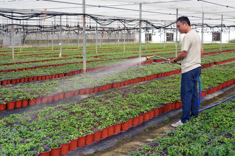 初秋時節,走進新洋農場容器苗項目基地,素有“百日紅”之稱的紫薇花進入了盛花期?;毓芾砣藛T梁亞洲正在為紫薇花瓶噴施營養液,順手修剪掉雜枝,為紫薇健康生長提供保障。紫薇花期長,是觀花、觀干、觀根的盆景良材,一棵培育良好、株高2米的紫薇花瓶容器苗木市場價可達2000元以上,具有良好的經濟效益和景觀效果?!搬槍η锛咀限鄙L特點,我們還集中對紫薇進行了抹芽、修枝、除草,保證苗木生長良好、發育健壯、形狀優美?!绷簛喼拚f,紫薇是一種綠化點綴效果很好的觀賞苗木,尤其是夏秋季道路綠化開花小喬木不多,紫薇正好填補了這個季節的空白。2020年以來,新洋建成配有溫室大棚、水肥一體、智能控制、基質配方、節水灌溉等設備的容器苗圃200畝,主打球類、造型類、花喬類等綠化苗木產品近萬株。在栽培方式上,林業公司大膽嘗試,自行研發優化不同容器苗基質配比,開展扦插培育試驗,實現了自繁自育栽培技術的新突破?!斑@黑色薄膜包裹的是控根器,由于現在溫度較高,水分蒸發快,容器苗基質易缺水,要及時引水灌溉,濕透苗床,以保持土壤濕潤?!绷謽I公司副總經理蔡仿介紹,針對當前溫度過高的情況,管理人員在后臺打開自動化噴淋設備,一體化水肥系統在