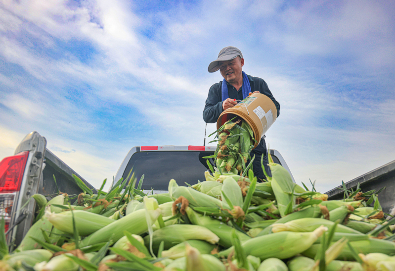 盛夏時節,新洋大地滿目青綠,在新洋農場公司百畝水果玉米種植基地,陸續成熟的水果玉米搶“鮮”上市,空氣中彌漫著豐收的喜悅與甜蜜的味道。采摘、裝袋、搬運、裝車……走進新洋水果玉米種植基地,一桿桿垂著褐色胡須的水果玉米整齊排列,顆粒飽滿,長勢喜人。志愿者們穿梭在玉米林中,動作嫻熟地把個頭飽滿的玉米采摘下來,不一會兒就裝滿了一大車,田間地頭一派繁忙景象。“水果玉米長勢好,每畝產出在3000株左右,基本上每個玉米棒都有18至20厘米,每畝玉米地能有1噸產量以上,都是一等品。”水果玉米基地負責人趙丙華滿臉喜悅地說,種植期間,新洋采用水肥一體化和全程機械化種植模式,綠色防控、科學施肥、實施統防統治,減少農藥施用量,在提高畝產量的同時,保證了玉米的食用品質。剝開水果玉米苞葉,玉米色澤鮮亮、籽粒飽滿、圓潤香嫩,用手輕輕一摁,粒粒爆漿、鮮香四溢……趙丙華為新洋水果玉米打起了宣傳廣告。“水果玉米,可以生食,甜脆爆漿!富含特殊的清香,甜度、水分、口感都格外出眾,因此一上市就成功‘圈粉’。”趙丙華介紹道,水果玉米籽粒中含有多種維生素類物質和人體所必需的8種氨基酸,素有“水果之王”“蔬菜之王”美稱,是炎炎夏日力推